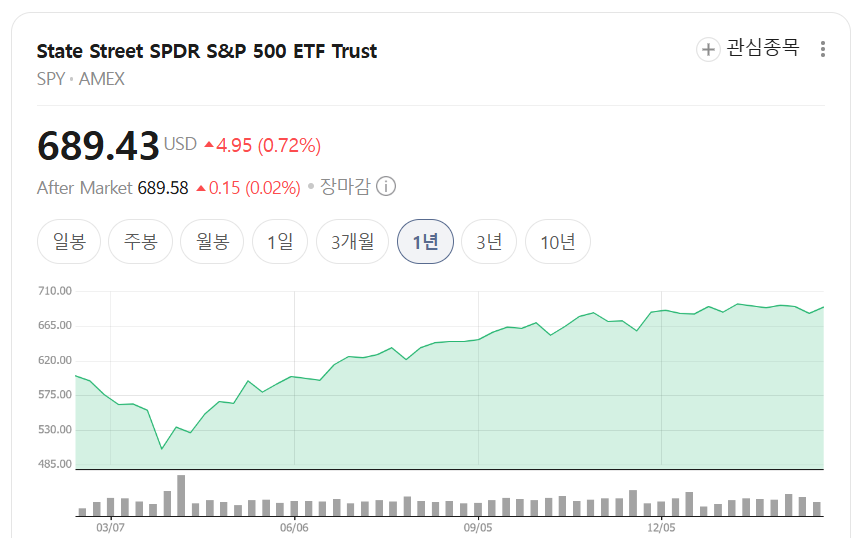 미국 주식시장 평균 수익률을 그대로 추구하고 싶다면 SPY는 가장 기본이 되는 선택지입니다.
